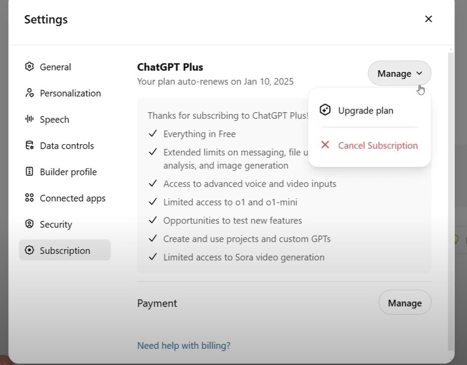 - In the settings menu, find the “Subscription” or “Manage Subscription” option. Here, you can view details about your ChatGPT Plus subscription.