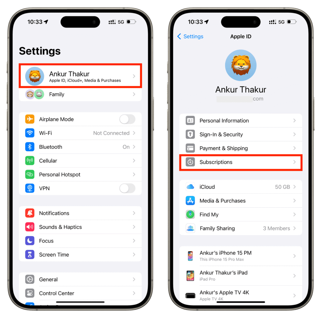 - Scroll down and tap on your name at the top of the screen. This will take you to your Apple ID settings. Next, look for “Subscriptions” and tap it to see all your active subscriptions.