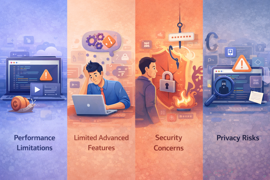 - Performance issues arise with larger projects, causing frustration for novice coders.